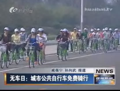 記者戚蓓寧:這里是珠山景區(qū),在我身旁的是我市剛剛建成的公共自行車停車站點,大家能看到50輛嶄新的綠色自行車停在這里格外醒目,今天恰逢世界無車日,這里將要舉行的是市民免費體驗騎游活動。這種綠色出行的方式及低碳環(huán)保,同時也能有效緩解城市交通的壓力。
