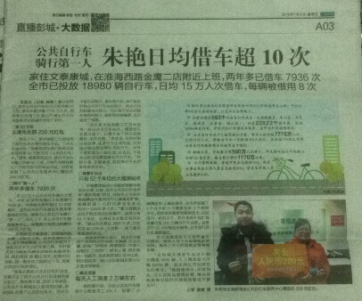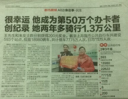 王先生和朱女士昨分別獲得200元獎(jiǎng)金。截至上月我市公共自行車共建設(shè)593個(gè)站點(diǎn),投放18980輛車,共計(jì)借車7775萬(wàn)人次,日均15萬(wàn)人次