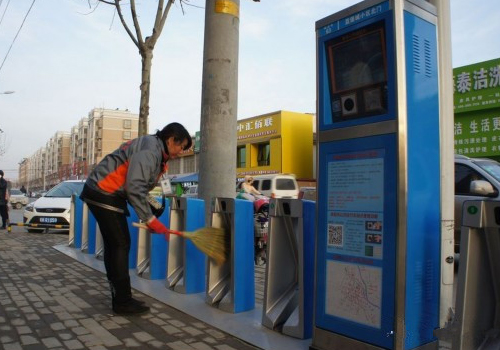 存放了一整夜的“小綠”,車身上早已蒙上一層灰塵,李莉打開車筐,將抹布在水桶中清洗干凈,來回認真擦拭著自行車車身和鎖車器,尤其是市民直接接觸到的刷卡區(qū)位置。隨后她拿起小笤帚掃落掉鎖車器卡口內側的灰塵,打掃下周邊地面衛(wèi)生。立春后的清早,空氣中還滲透著絲絲寒意,記者此時的手腳已漸冰涼,但李莉的身影,卻一直忙碌在站點前。