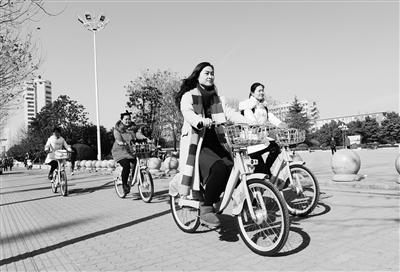 在安徽省阜陽(yáng)市,投入運(yùn)營(yíng)的公共自行車項(xiàng)目受到越來(lái)越多市民的青睞。圖為今年1月19日,阜陽(yáng)市民騎著公共自行車出行。