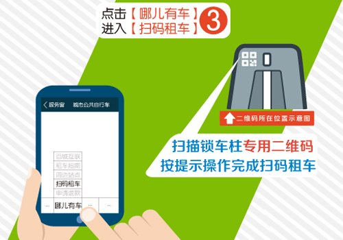 智能手機(jī)用戶點(diǎn)擊支付寶app,在“服務(wù)窗”內(nèi)搜索添加【城市公共自行車】,并進(jìn)入【城市公共自行車】頁(yè)面;點(diǎn)擊“哪兒有車”中選擇“掃碼租車”;掃描鎖車柱上的掃碼租車專用二維碼,按提示操作即可輕松租車,流程簡(jiǎn)單便捷。