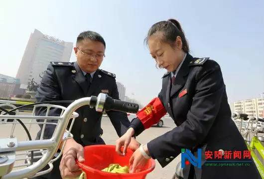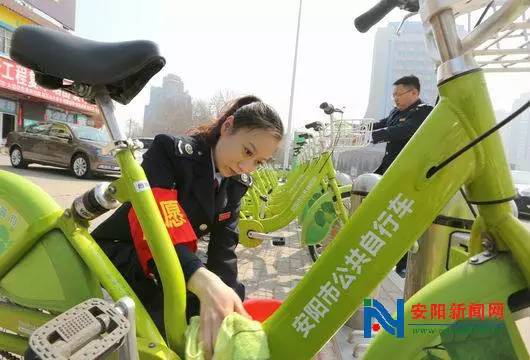 2016年3月1日,安陽市高新區(qū)七仙女轉(zhuǎn)盤公共自行車租賃站點,高新區(qū)國稅局的青年志愿者正在為20輛綠色環(huán)保的公共自行車進(jìn)行保潔。