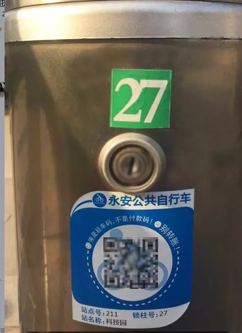 5、路人君在距離自己最近的一個(gè)站點(diǎn)上,發(fā)現(xiàn)每一個(gè)停車樁上都貼上了一個(gè)二維碼。