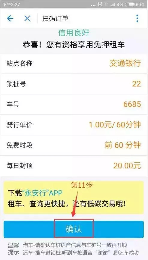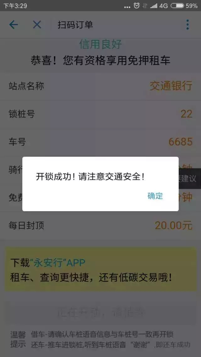 9、填寫好支付密碼后,跳轉(zhuǎn)的界面上,我們可以看到上面有站點(diǎn)名稱、鎖樁號(hào)、車號(hào)、騎行單價(jià)、免費(fèi)時(shí)段以及每日封頂。