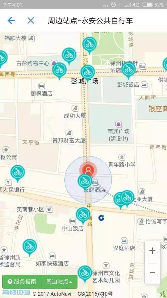 點(diǎn)進(jìn)去以后,手機(jī)自動(dòng)定位了路人君當(dāng)時(shí)所在的位置,并且將周圍公共自行車的站點(diǎn)顯示了出來。