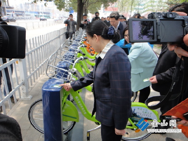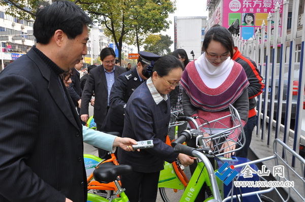 在大市口廣場上,朱曉明、雷志強一行首先閱讀了標注有公共自行車使用方法和車位分布圖的展牌。朱曉明要求市城管部門更廣泛地宣傳使用方法和車位分布圖,讓更多市民知曉,并在試運行的一個月中及時聽取他們的意見和建議,隨時加以改進,以便5月1日正式運行時給市民帶去更多方便。隨后,朱曉明、雷志強及有關部門負責人來到位于房產(chǎn)交易中心外的車位上各自取了一輛自行車騎上了解放路。