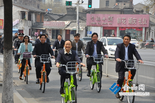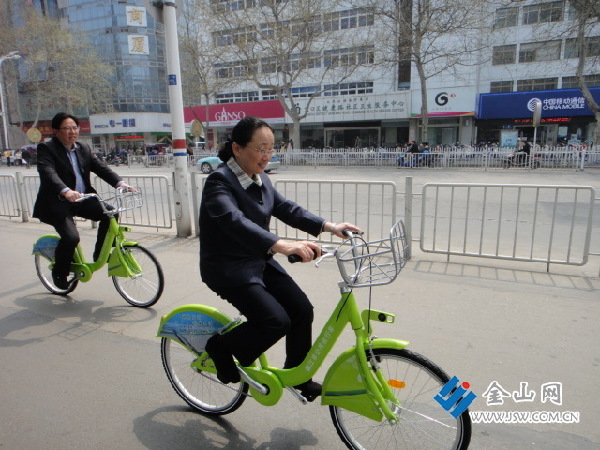 金山網(wǎng)訊 “在路上騎自行車,感覺很舒服!”昨天上午,市長朱曉明騎著公共自行車,在解放路上騎行一段下車后對記者說。隨著朱曉明、雷志強等市領導騎車上路,第一批1000輛公共自行車開始為市民服務。
